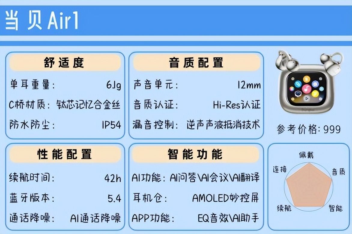 核心参数:单耳6.1克、12mm巨能动圈单元、抗菌银离子、LHDC 5.0、IP54防水、总续航42小时;